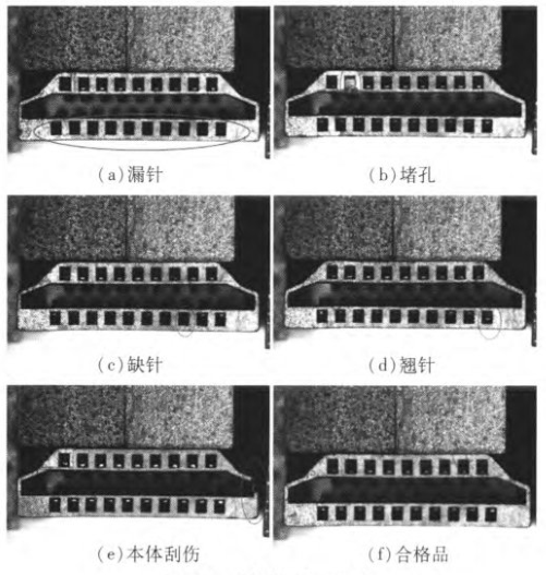 根據(jù)生產(chǎn)實(shí)際統(tǒng)計(jì),連接器缺陷特征主要包括:① 漏針:本體槽內(nèi)無針,金屬物缺失;② 堵孔:本體槽內(nèi)填充有異物,針被遮擋;③ 缺針:個(gè)別本體槽無針;④ 翹針:針彈起高度超過允許值;⑤ 本體刮傷:本體端面受機(jī)械損傷。