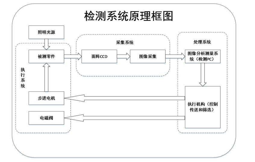 檢測(cè)原理如下:在照明系統(tǒng)、圖像采集系統(tǒng)和運(yùn)動(dòng)控制系統(tǒng)的幫助下獲取圖像,把獲取到的電子連接器圖像信號(hào)傳輸?shù)絇C機(jī),在PC上進(jìn)行圖像處理與檢測(cè),完成缺陷檢測(cè)任務(wù),將檢測(cè)結(jié)果在顯示器上進(jìn)行顯示,并傳動(dòng)給執(zhí)行單元執(zhí)行相應(yīng)的操作。