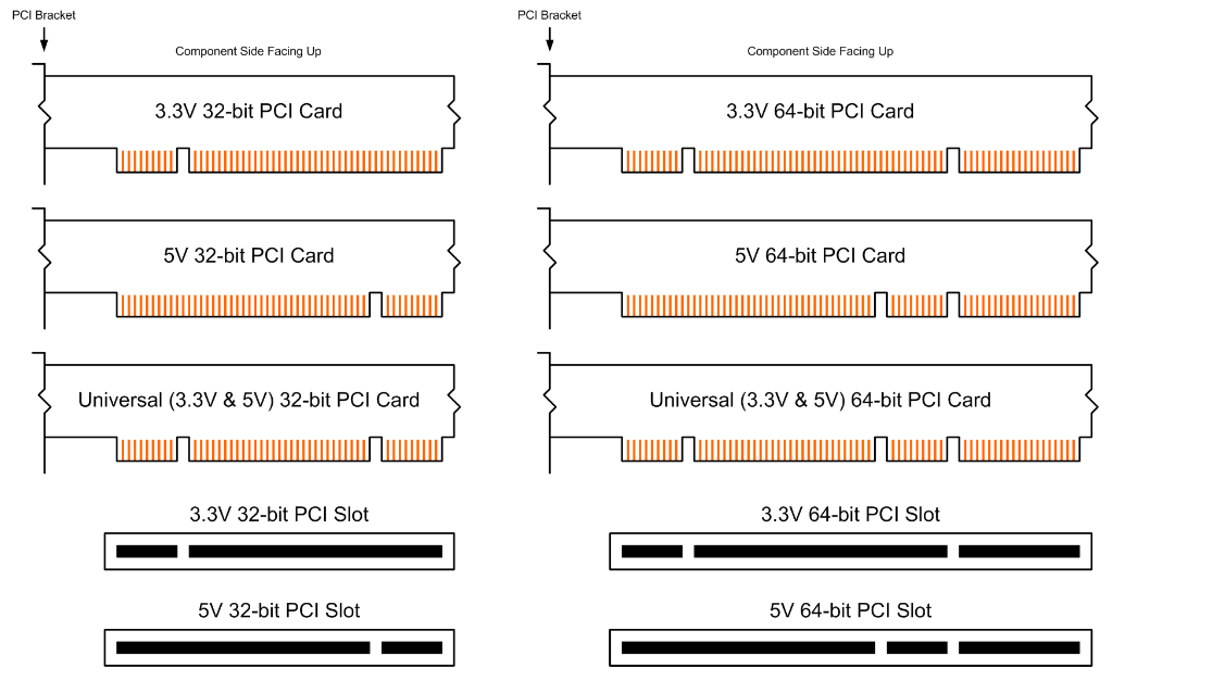 PCI有幾種不同的接口樣圖:現(xiàn)在生產(chǎn)的多為通用模式的以防插錯(cuò)。還有64bit統(tǒng)一比32bit的寬出右邊缺口的部分。