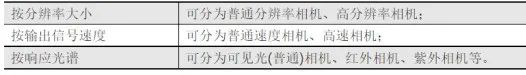 工業(yè)相機按照芯片類型、傳感器結(jié)構(gòu)特性、掃描方式、分辨率大小、輸出信號方式、輸出色彩、輸出信號速度、響應(yīng)頻率范圍等有著不同的分類方法。