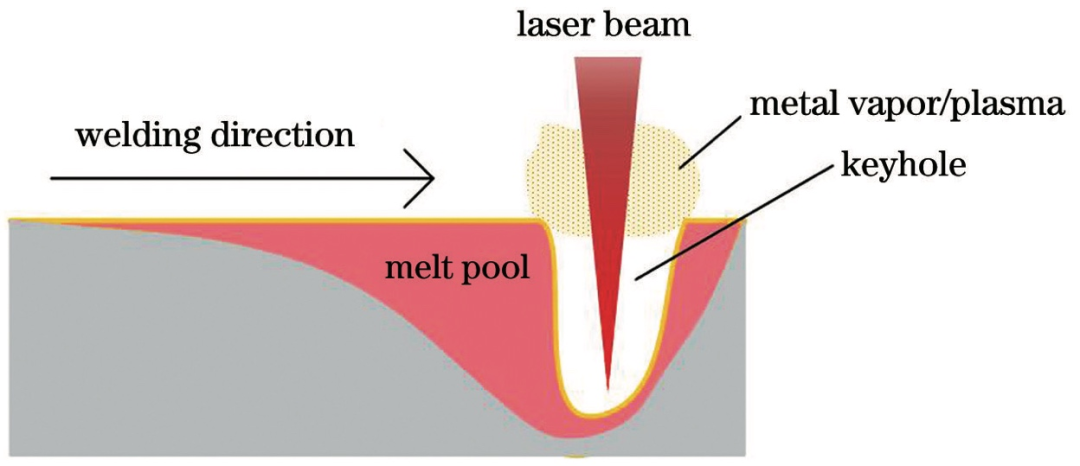 激光深熔焊工藝原理(圖1)如下:當(dāng)激光功率密度達(dá)到一定水平時(shí),材料表面發(fā)生氣化,從而形成匙孔。當(dāng)孔內(nèi)金屬蒸氣壓力與四周液體的靜壓力和表面張力達(dá)到動(dòng)態(tài)平衡時(shí),激光可通過(guò)匙孔照射到孔底,隨著激光束的運(yùn)動(dòng),形成連續(xù)的焊縫。在激光深熔焊焊接過(guò)程中,不需要添加輔助焊劑或填料,即可將工件自身材料焊接為一體。