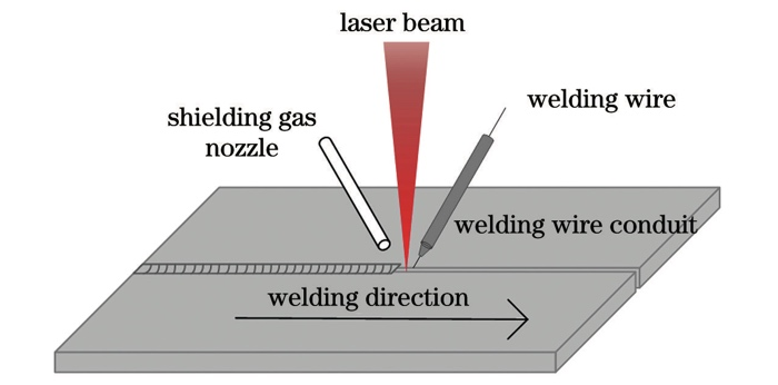 激光填絲焊接工藝原理如下:通過(guò)在焊縫中預(yù)先填入特定焊絲或在激光焊接過(guò)程中同步送入焊絲來(lái)形成焊接接頭。相當(dāng)于在激光深熔焊時(shí)向焊縫熔池中輸入近似同質(zhì)的焊絲材料。激光填絲焊工藝的示意圖如圖2所示。