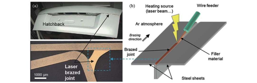 圖3 激光釬焊在汽車(chē)中的應(yīng)用:(a)后車(chē)蓋激光焊接;(b)激光釬焊原理圖