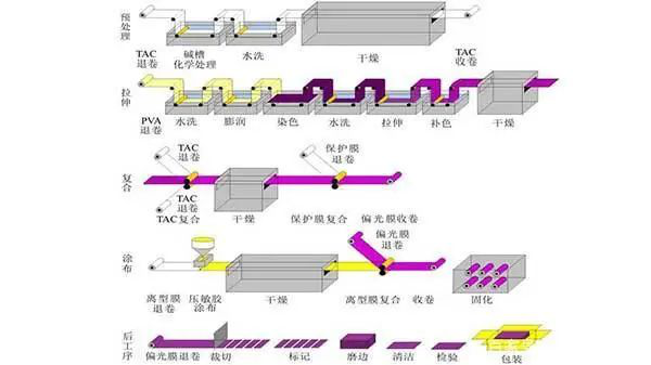 偏光片的生產(chǎn)工藝按拉伸工藝來分,有干法拉伸和濕法拉伸兩種;按染色工藝來分,有染料染色和碘系染色兩種。偏光片的制備過程包括前工序、中工序和后工序三個工序。前工序包括制膜、清洗、染色、拉伸、復(fù)合 TAC 保護膜及烘干固化等步驟。