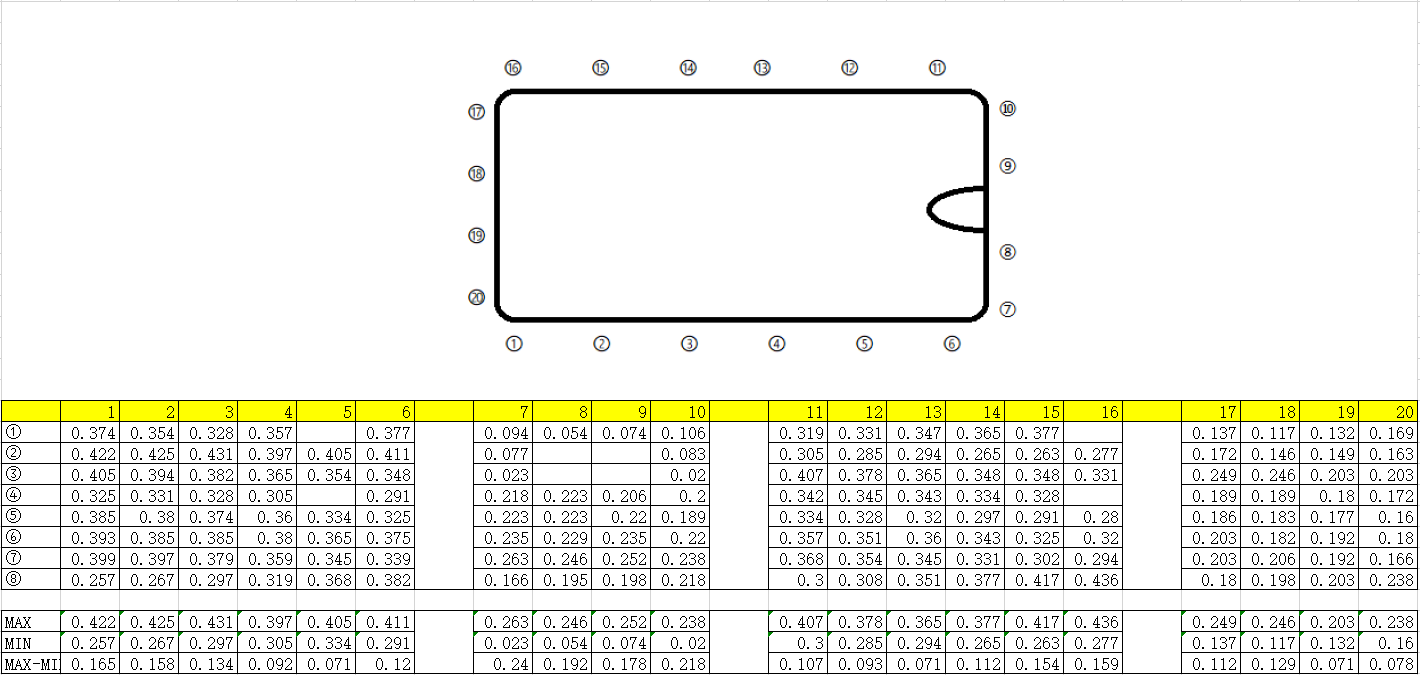 下圖為同邊對位時測試的8組產品的數據。用于對位的點位為①和⑥。