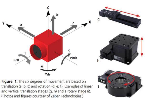 圖1:基于平移(a、b、c)和旋轉(zhuǎn)(d、e、f)的六個運動維度,以及線性和垂直平移臺(g、h)和旋轉(zhuǎn)臺(i)示例。(圖片來源:ZaberTechnologies)