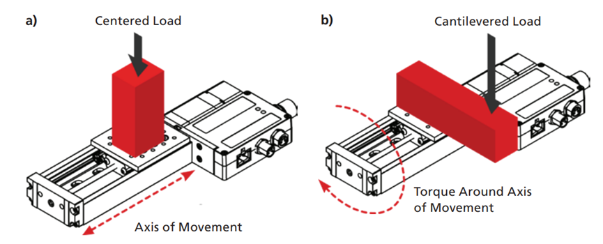 圖5:中心載荷垂直于運動軸施加力(a),懸臂荷載圍繞運動軸施加扭矩(b)。
