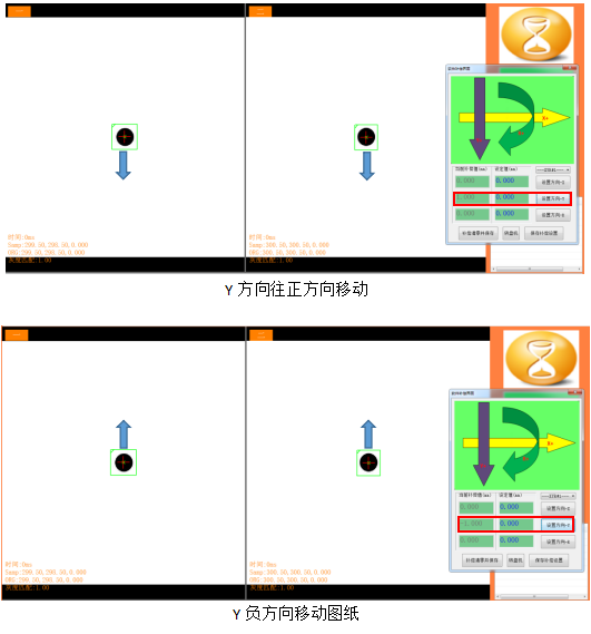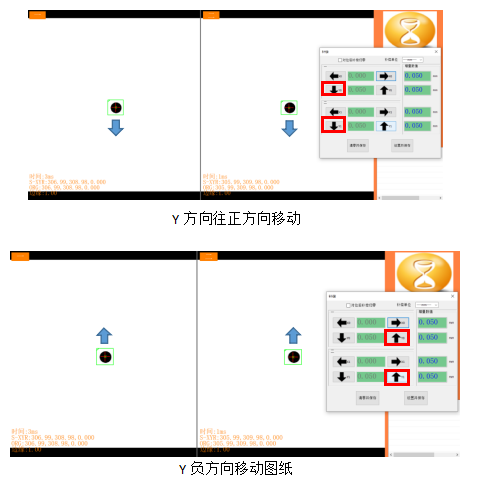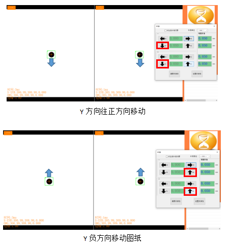 3. 在兩相機(jī)水平擺放時(shí),軸1輸入數(shù)值1(補(bǔ)償單位默認(rèn)mm),此時(shí)軸1(左相機(jī)CCD1的Y方向)會(huì)往箭頭指向走補(bǔ)償1mm,軸2軸0在不更改的情況,通過(guò)內(nèi)部算法的軟件補(bǔ)償,位置基本不會(huì)發(fā)生變化。