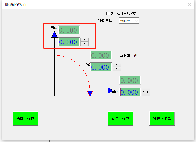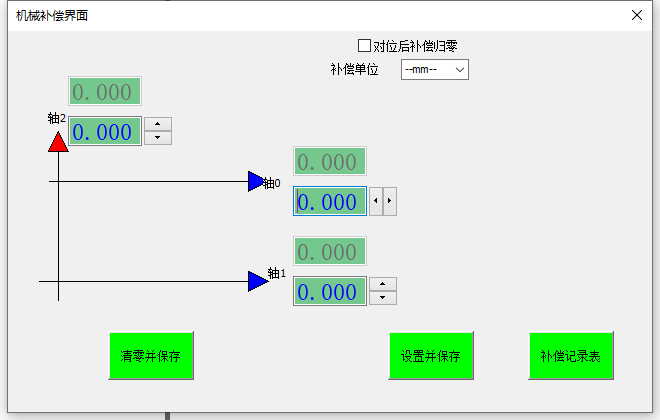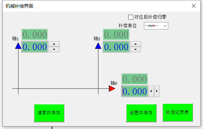 2. 機(jī)械補(bǔ)償界面▲箭頭指向的方向即為正向,相反則為反向,分別通過(guò)點(diǎn)擊軸方向的上下按鈕或者鍵入數(shù)值可以修改補(bǔ)償值,點(diǎn)擊[設(shè)置并保存]即可生效
