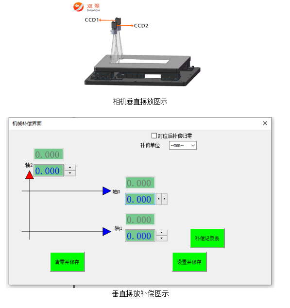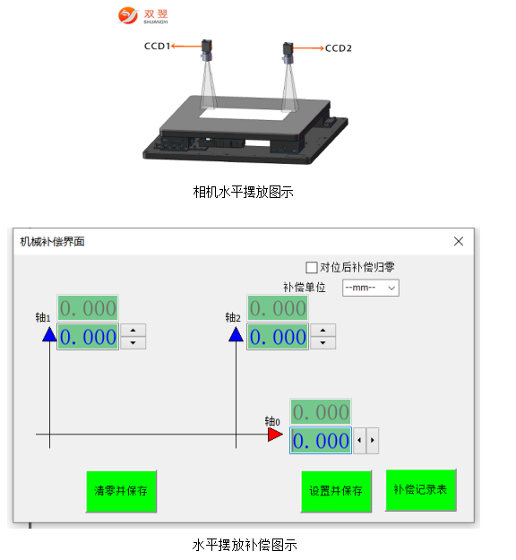2. 相機(jī)軟件補(bǔ)償界面圖所示軸1▲箭頭指向?yàn)檠a(bǔ)償?shù)恼?,反之為反向。軸1代表左邊相機(jī)CCD1,軸2代表右邊相機(jī)CCD2,可分別通過(guò)點(diǎn)擊軸1軸2軸0的上下按鈕或者鍵入數(shù)值可以修改補(bǔ)償值,點(diǎn)擊[設(shè)置并保存]即可生效