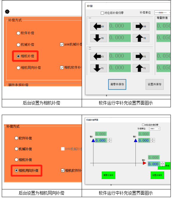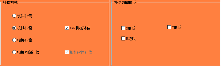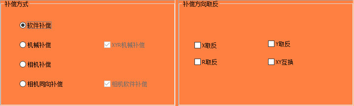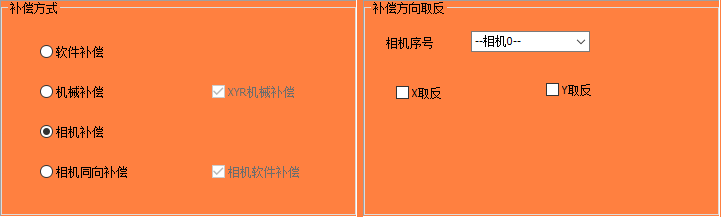 與常規(guī)的相機(jī)補(bǔ)償不同是,相機(jī)同向補(bǔ)償可將兩相機(jī)的X或Y同個(gè)方向進(jìn)行補(bǔ)償;在兩個(gè)相機(jī)的X方向同向補(bǔ)償時(shí),兩個(gè)相機(jī)的Y方向單獨(dú)補(bǔ)償,而Y方向同向補(bǔ)償時(shí),兩相機(jī)的X方向單獨(dú)補(bǔ)償;