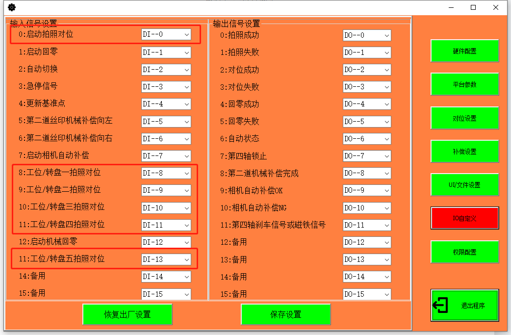 4. 需要注意多組工位或轉(zhuǎn)盤(pán)有不同的對(duì)位信號(hào)區(qū)分(輸入信號(hào)需要發(fā)送:工位/轉(zhuǎn)盤(pán)一二三四五拍照對(duì)位信號(hào)+DI0啟動(dòng)拍照對(duì)位信號(hào)進(jìn)行區(qū)分)