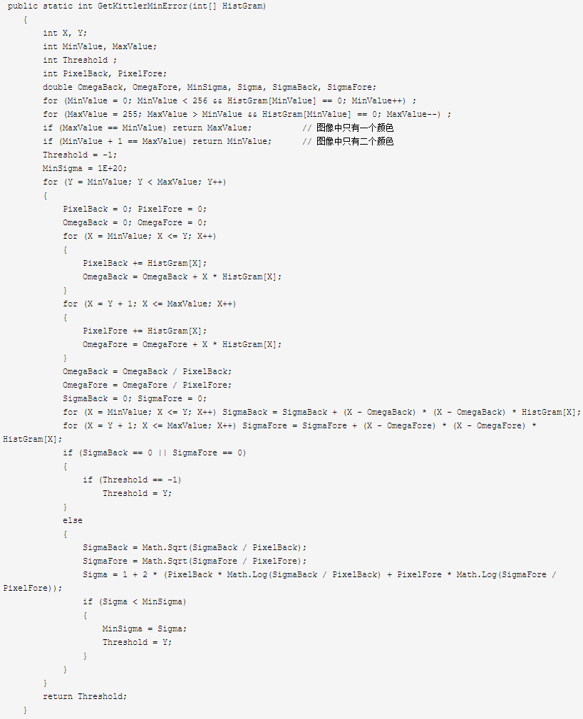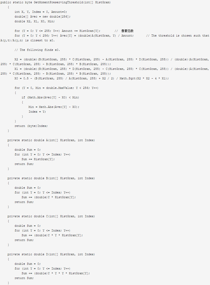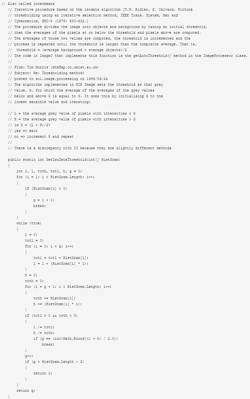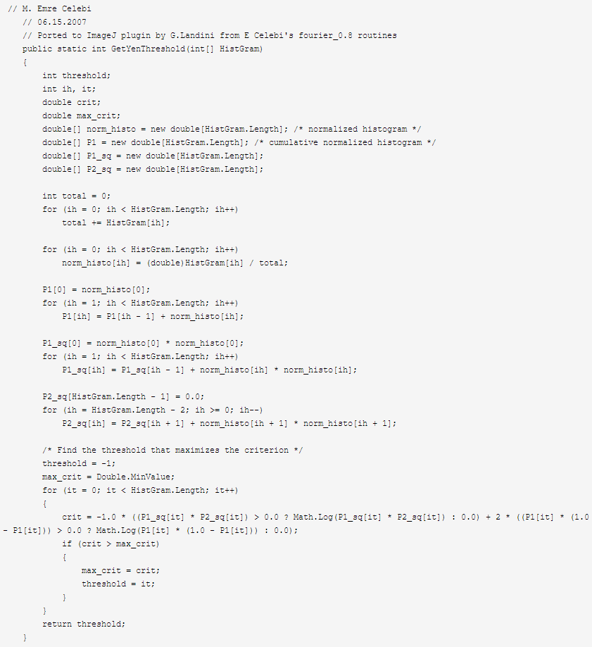 一行很多代碼是摘自開(kāi)源軟件ImageJ的資料,讀者也可以參考:http://fiji.sc/wiki/index.php/Auto_Threshold 這里獲得更多的信息。