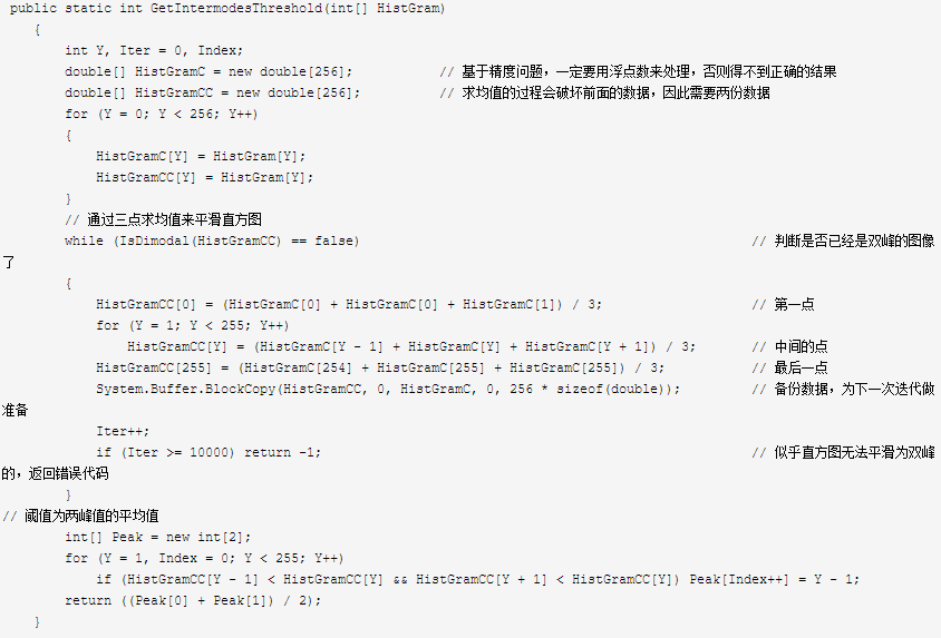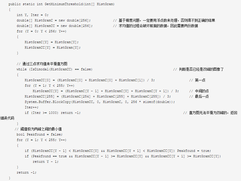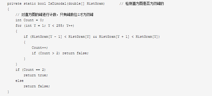 其中IsDimodal函數(shù)為判斷直方圖是否是雙峰的函數(shù),代碼如下: