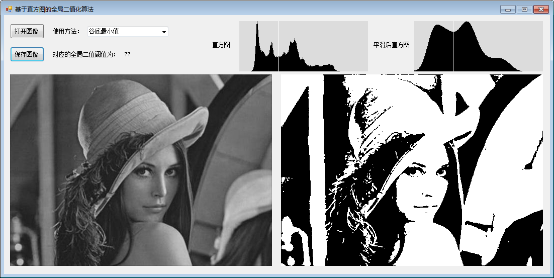 此方法實(shí)用于具有明顯雙峰直方圖的圖像,其尋找雙峰的谷底作為閾值,但是該方法不一定能獲得閾值,對(duì)于那些具有平坦的直方圖或單峰圖像,該方法不合適。