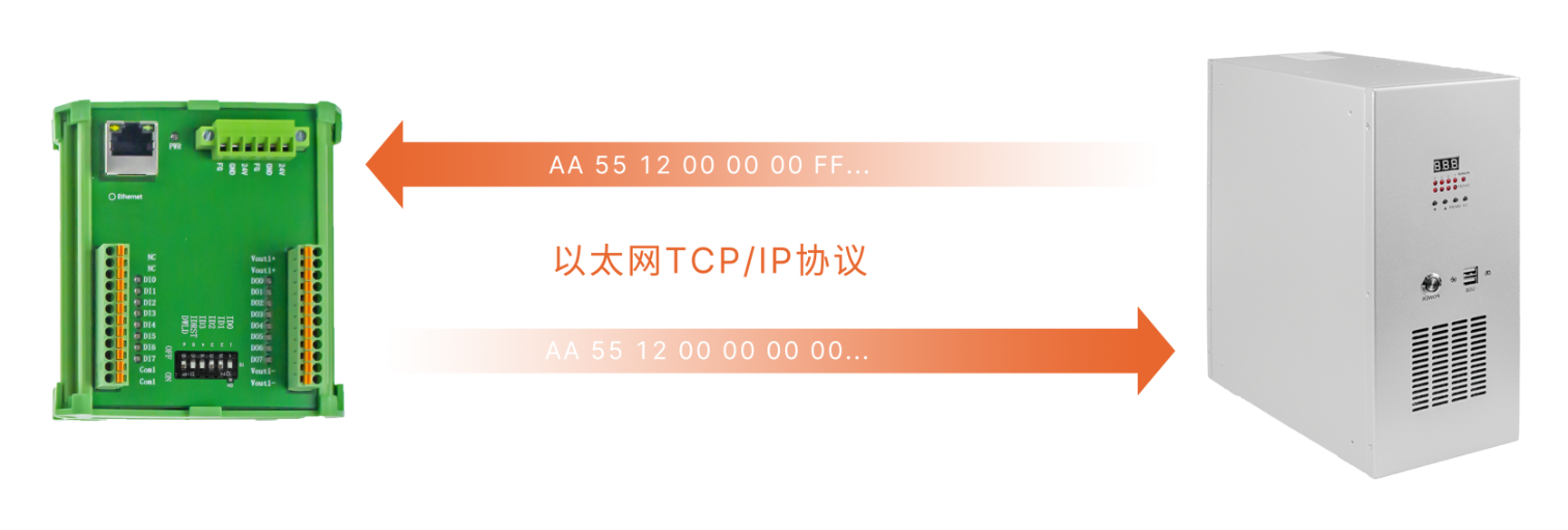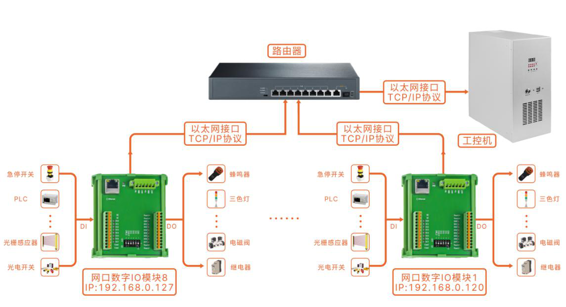 網(wǎng)口數(shù)字I/O模塊使用自定義TCP/IP協(xié)議進(jìn)行通信,通過交換機(jī)配合組成局域網(wǎng),每個(gè)模塊獨(dú)立通信互不干擾,擴(kuò)展增容極其簡單方便。
