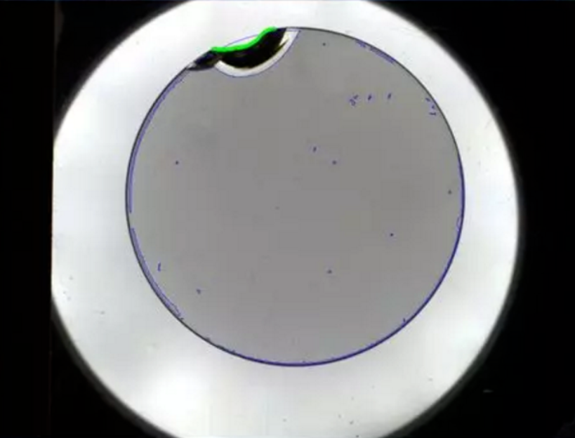 檢測效果圖中,藍(lán)色代表污漬等有問題的區(qū)域(精度為0.39mm);綠色代表透鏡缺損部分。檢測效率可達(dá)3秒/個,誤檢率低于0.1%。