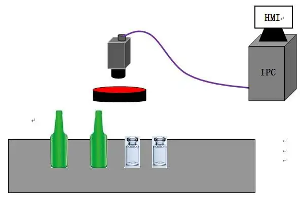 在生產(chǎn)線上安裝玻璃瓶瓶口缺陷檢測系統(tǒng),玻璃瓶流入視覺檢測工位時,通過觸發(fā)機(jī)器視覺傳感器拍得玻璃瓶瓶口圖片送入系統(tǒng),系統(tǒng)對所拍圖片進(jìn)行提取分析并和設(shè)定的比較得知瓶口是否有缺陷,當(dāng)檢測到玻璃瓶瓶口有缺陷時,系統(tǒng)發(fā)出聲光報警并發(fā)出停機(jī)信號。