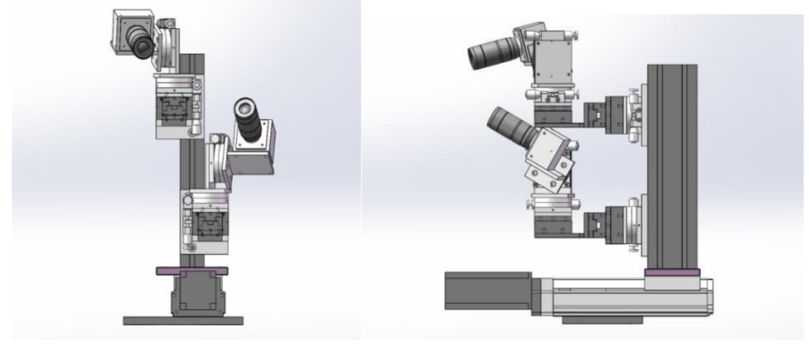 因被檢測的產(chǎn)品表面為圓柱形弧面,因此至少需要兩個相機進行拍攝。工業(yè)相機的安裝需根據(jù)待檢產(chǎn)品的形狀和尺寸,冬像的清晰度和景深的要求,調(diào)節(jié)拍攝的距離和拍攝的角度。另相機不僅可以進行調(diào)節(jié),還可以隨著運動模組進行水平方向的運動,進一步動態(tài)地控制拍攝距離。