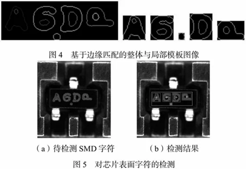 字符缺陷識別采用基于邊緣特征的模板匹配。模板匹配的基本思想是讓模板在目標(biāo)圖像中做平移運(yùn)動,將模板左上角和待檢測的圖像左上角重合,每移動一個(gè)像素,計(jì)算模板與待匹配圖像的相似度,遍歷結(jié)束之后,將符合閾值的位置認(rèn)定為最佳匹配位置?;诨叶鹊幕ハ嚓P(guān)模板匹配是通過用模板圖像遍歷待匹配圖像,每移動一個(gè)像素,計(jì)算對應(yīng)部分的互相關(guān)值,將互相關(guān)值的最大值作為最佳匹配位置?;诨叶鹊幕ハ嚓P(guān)模板匹配缺點(diǎn)是在光場不均勻情況下,不具有魯棒性。歸一化互相關(guān)系數(shù)法是一個(gè)亮度、對比度線性不變量,能夠明顯改善光照的線性變化帶來的影響。但是隨著圖像分辨率的提高,圖像匹配的時(shí)間會增加,匹配準(zhǔn)確度也存在差異,甚至?xí)l(fā)生匹配失效的情況,并且由于半導(dǎo)體芯片的位姿和完整性等存在差異,會引起光照的非線性變化,這會導(dǎo)致圖像的灰度差異大,進(jìn)而導(dǎo)致模板匹配結(jié)果不準(zhǔn)確。較于基于灰度的互相關(guān)模板匹配,基于邊緣的模板匹配不需要建立兩幅圖像之間點(diǎn)的對應(yīng)關(guān)系,具有較好的魯棒性。模板由目標(biāo)圖像邊緣的一系列點(diǎn)組成,如下圖。