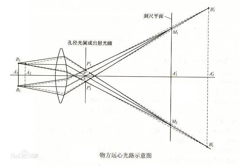 1).物方遠心光路是將孔徑光闌放置在光學系統(tǒng)的像方焦平面上,物方主光線平行于光軸主光線的會聚中心位于物方無限遠,稱之為:物方遠心光路。其作用為:可以消除物方由于調焦不準確帶來的,讀數(shù)誤差。