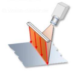 明場照明是使用線掃描相機(jī)進(jìn)行表面檢查的標(biāo)準(zhǔn)方法,攝像機(jī)和照明設(shè)備的布置方式應(yīng)使攝像機(jī)處于照明設(shè)備的反射角(入射角=反射角)。以這種方式,盡可能多的入射光被檢測到。這在反射材料的情況下特別有效。以這種方式,明亮的區(qū)域顯示為明亮,黑暗的區(qū)域?yàn)楹诎怠H绻砻娼Y(jié)構(gòu)的角度不適合對齊而是傾斜,則它們在相機(jī)圖像中也會顯得很暗。表面的刮痕或傾斜的相位等在圖像中具有較深的灰色陰影。
