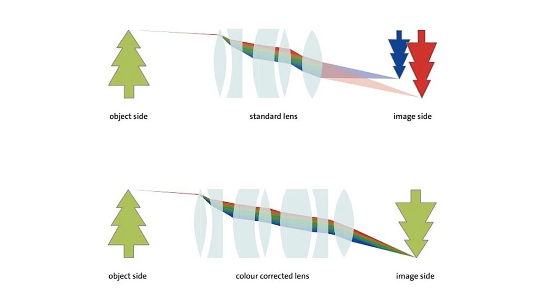 當(dāng)不同波長(zhǎng)的光通過(guò)空氣-玻璃界面時(shí),每個(gè)波長(zhǎng)都會(huì)折射不同的量。這種色散是一個(gè)可測(cè)量的量,會(huì)導(dǎo)致鏡頭產(chǎn)生色差,鏡頭的邊緣會(huì)模糊物體的邊緣,從而無(wú)法進(jìn)行準(zhǔn)確的機(jī)器視覺(jué)測(cè)量。有數(shù)百種具有不同色散特性的不同光學(xué)玻璃類(lèi)型可供選擇,從而可以生產(chǎn)具有各種玻璃元件以補(bǔ)償色差效應(yīng)的消色差透鏡(圖 1)。使用單色光源時(shí)只需要更簡(jiǎn)單的鏡頭設(shè)計(jì),因?yàn)闆](méi)有色差。