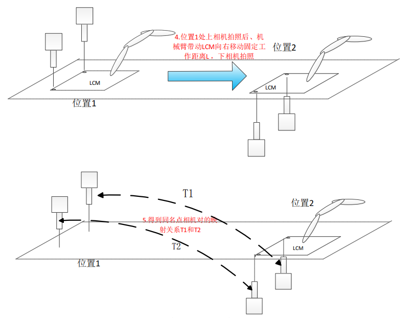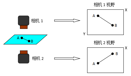 假設(shè)相機(jī)1和相機(jī)2觀察同一片產(chǎn)品上A、B兩點(diǎn)(一般地,產(chǎn)品需要從相機(jī)1移動(dòng)至相機(jī)2處),相機(jī)1視野中A、B兩點(diǎn)坐標(biāo)被保存在Data1[2]數(shù)組,相機(jī)2視野中A、B兩點(diǎn)坐標(biāo)被保存在Data2[2]數(shù)組,那么我們就可以調(diào)用SY_MD_StudyAtoB( )實(shí)現(xiàn)相機(jī)映射學(xué)習(xí)。