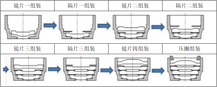 手機(jī)鏡頭組裝首先需進(jìn)行鏡筒排布,而后按照圖面技術(shù)要求,按一定的部品組裝順序進(jìn)行鏡片、遮光片、隔圈、壓圈等部品的組裝(其中,鏡片、壓圈組裝一般需要經(jīng)過壓入工藝),最后進(jìn)行膠水涂布、膠水曝光,送入后道外觀、性能檢驗(yàn)。