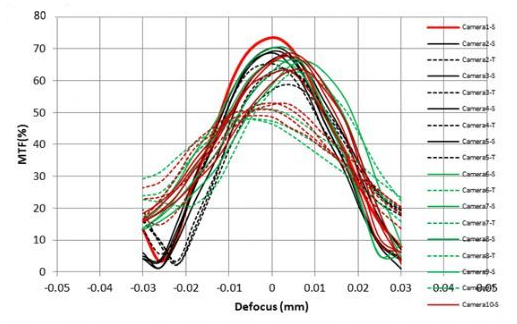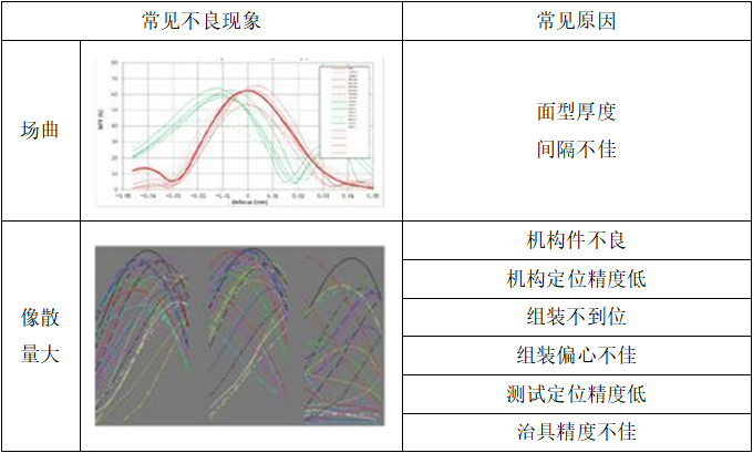 上面介紹了鏡頭的組裝過程及其要素,那么怎么去評價(jià)一顆合格的鏡頭呢?方法有很多包括解像力評價(jià)、透射偏芯檢測、場曲分析等。這里簡單介紹下較常用的離焦分析,通過以下離焦數(shù)據(jù)可以較快捷有效的分析一個鏡頭的品質(zhì),并根據(jù)其圖形形態(tài)分析原因。