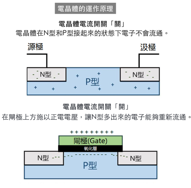 由于P型和N型分別多了電子和少了電子,所以晶體管在 N 型和 P 型接起來的狀態(tài)下電子不會流通,此時電流開關(guān)為「關(guān)」。