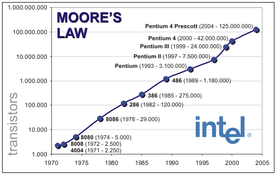 1960年代集成電路的發(fā)明,讓許多的半導(dǎo)體組件可以一次放在一塊芯片上。隨著半導(dǎo)體的縮小,IC上可容納的晶體管數(shù)目,約每隔兩年便會增加一倍、性能每18個月能提升一倍 。