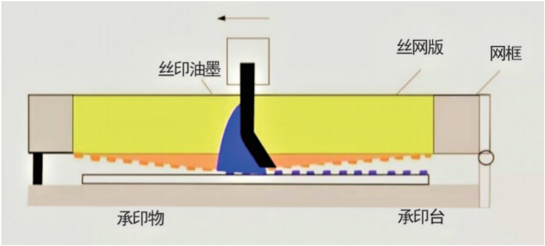 絲網(wǎng)印刷的原理是使圖文部分的油墨通過網(wǎng)孔轉(zhuǎn)移到承印物上形成印跡,其原理如下圖所示。絲網(wǎng)印刷包括平版絲網(wǎng)印刷和滾筒絲網(wǎng)印刷。平版絲網(wǎng)印刷的主要流程是將油墨置于絲網(wǎng)印版上,通過刮墨刀對(duì)其施加壓力,使油墨通過網(wǎng)孔轉(zhuǎn)移到承印物上;滾筒絲網(wǎng)印刷則是在滾筒上安裝印版,通過滾筒的轉(zhuǎn)動(dòng)來(lái)帶動(dòng)基底材料和印版并進(jìn)行印刷。絲網(wǎng)印刷的操作成本低、工藝過程簡(jiǎn)單、印刷圖案多樣化、承印物可選擇性等優(yōu)點(diǎn)使其在電子產(chǎn)品的制備中發(fā)揮了巨大作用,也受到了越來(lái)越多研究人員的關(guān)注。但是,絲網(wǎng)印刷得到的電子產(chǎn)品的質(zhì)量受多種因素的影響,如油墨、印刷速度、刮墨刀位置、承印物材料等。其中,油墨是影響產(chǎn)品質(zhì)量的關(guān)鍵因素。