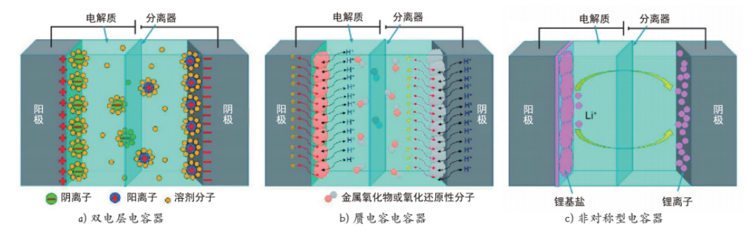 由于分類標(biāo)準(zhǔn)的差異,超級(jí)電容器有多種分類方法。首先,根據(jù)其工作原理的不同,如圖所示,超級(jí)電容器主要可分為雙電層電容器(EDLC)和贗電容電容器(PC);其次,根據(jù)電極結(jié)構(gòu),分為對(duì)稱型超級(jí)電容器和非對(duì)稱型超級(jí)電容器;最后,依據(jù)電解質(zhì)溶液類別,可分為水性電解質(zhì)和有機(jī)電解質(zhì)。