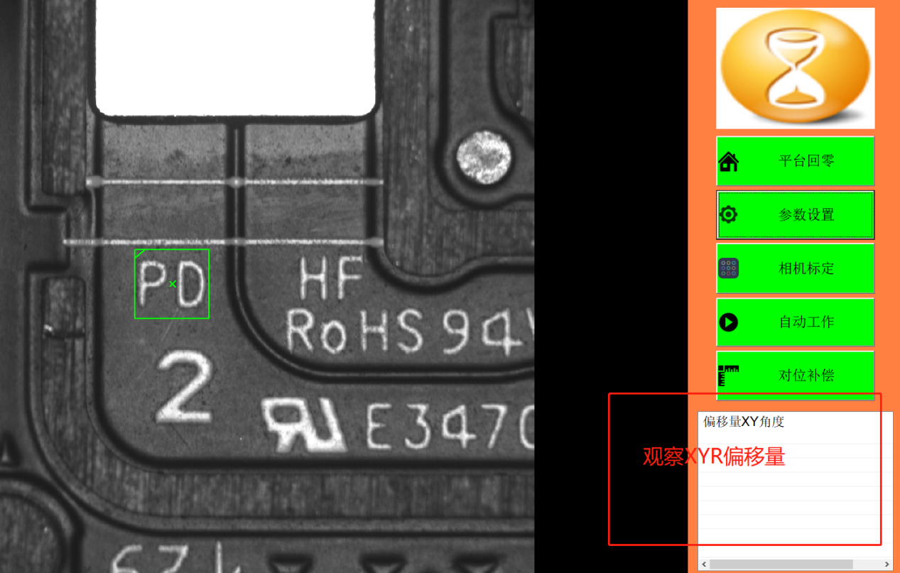 可以把視覺拍照延遲設(shè)置500ms以上(為了便于觀察,可以將延遲設(shè)置為5000ms甚至更大便于觀察),看第一次對位過程中XYR的偏移量數(shù)值是多少
