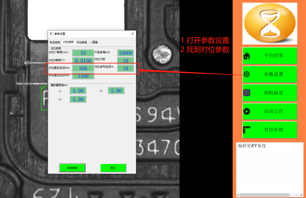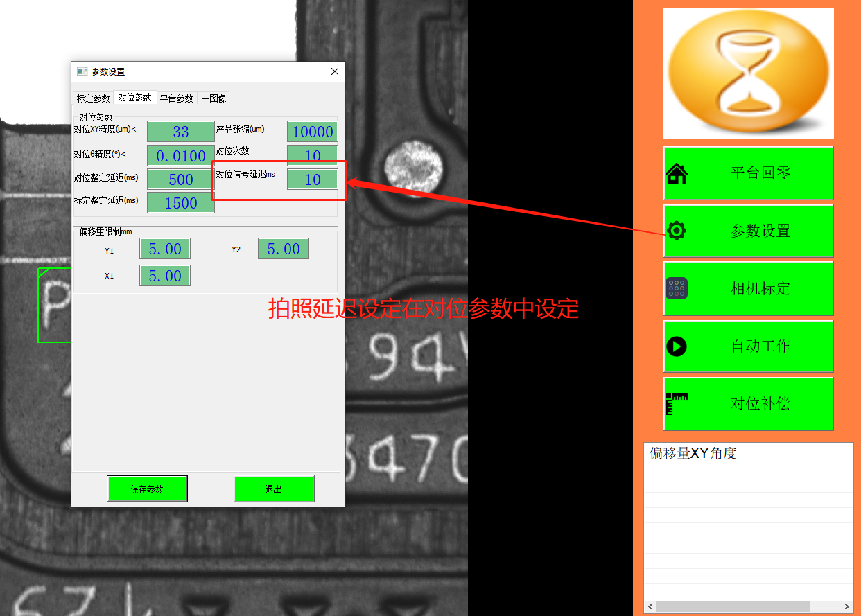 對位整定延遲的設(shè)定,一般是為了等待機(jī)臺停止穩(wěn)定,使得相機(jī)取得穩(wěn)定可靠的圖像,保障圖像處理的穩(wěn)定性,若是PLC或者其他運(yùn)動(dòng)控制已經(jīng)有整定停止時(shí)間保障了機(jī)構(gòu)的穩(wěn)定性,可減少拍照延遲的時(shí)間設(shè)定,提升對位速度;對位信號延遲則是收到IO信號后延時(shí)觸發(fā),正常情況下可默認(rèn)為10ms。