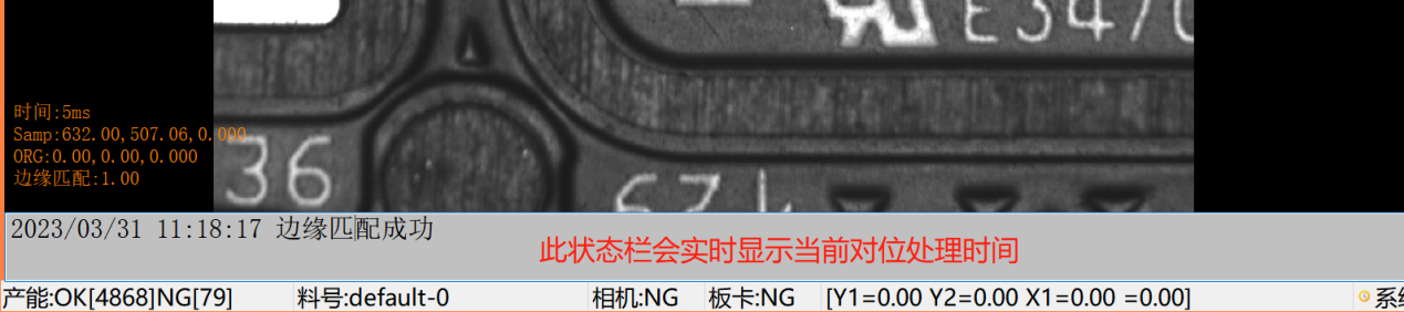 設(shè)定僅進(jìn)行一次對位,了解一次對位的圖像處理時(shí)間和速度等,圖8為視覺對位1次的拍照時(shí)間及圖像處理時(shí)間,再通過上文中圖2所示的對位偏差了解產(chǎn)品來料的誤差等