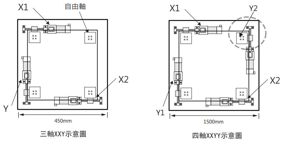 因制程不斷提升,為了能讓超大尺寸的XXY平臺也能精準(zhǔn)對位,由上圖可知,XXYY是把XXY中的自由軸也加上馬達(dá),使之稱為可主動帶動運動軸的軸向,故稱作XXYY。