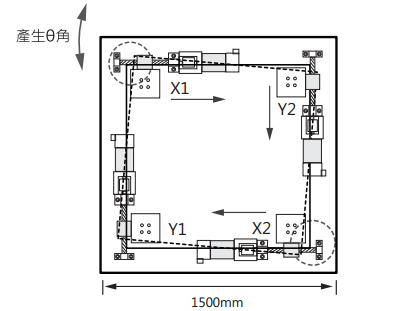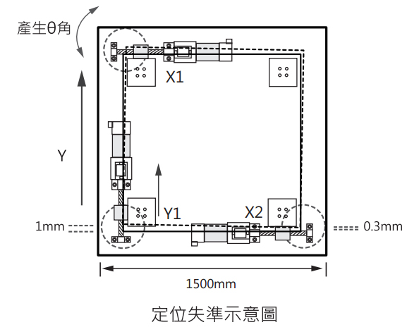 X1和X2不動作進(jìn)行計策,此時進(jìn)行Y方向移動,因大臺面的原因,單Y1推動的力量和機(jī)構(gòu)間存在的微小間隙,可能會導(dǎo)致整個臺面的移動不正確,產(chǎn)生誤角度出現(xiàn),出現(xiàn)定位失準(zhǔn)現(xiàn)象。