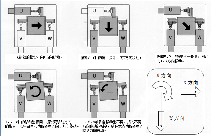 3個伺服電機(jī)控制U軸、V軸、W軸3軸, 能夠在任意位置定位的平臺。