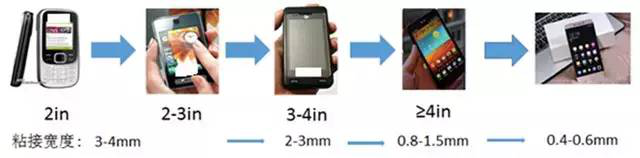 隨著人們對手機(jī)顯示面積及屏占比的要求越來越高,手機(jī)鏡片粘接寬度從最初的3~4mm, 減小到目前的0.4~0.6mm,甚至有的廠家在研究0.4 mm以下的方案,如圖2 所示。
