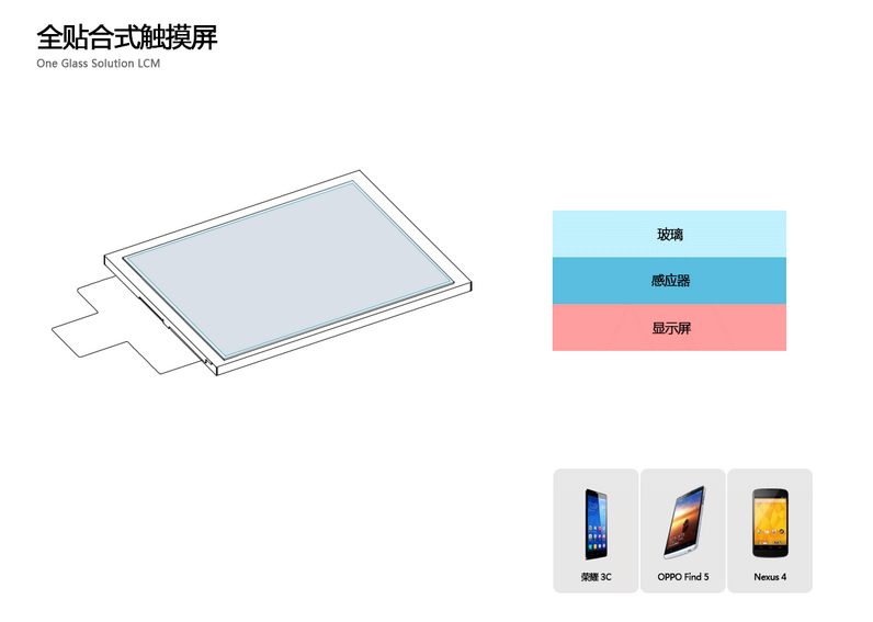 從結(jié)構(gòu)圖可以看出,感應(yīng)器與顯示屏之間的玻璃是不必要的,于是從2013年開始,主流價位手機中大量出現(xiàn)了使用“全貼合屏幕”的產(chǎn)品。
