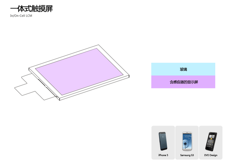 分離式是分開的兩個部件,全貼合是把兩個部件粘在一起,而一體化則是真正具備感應(yīng)功能的顯示屏,是最終極的解決方案。