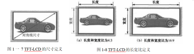 (2) 長(zhǎng)寬比(Aspect Ratio):長(zhǎng)寬比就是TFT-LCD可視區(qū)域的長(zhǎng)度和寬度之比,也叫縱橫比或屏幕比例。TFT-LCD的長(zhǎng)寬比主要有4:3,5:4,16:10,16:9四種。早期影視畫(huà)面比例都是標(biāo)準(zhǔn)的1. 33:1(即4:3),所以最適合用4:3的屏幕(如圖l-8(a))來(lái)觀看。而16:9的比例(如圖l-8(b))更接近黃金分割比,人眼觀看更舒服。因?yàn)殚L(zhǎng)寬比也叫縱橫比,所以在TFT- LCD產(chǎn)品設(shè)計(jì)時(shí),一般用HCHorizonta 1)表示長(zhǎng)度,V(Vertical)表示寬度。