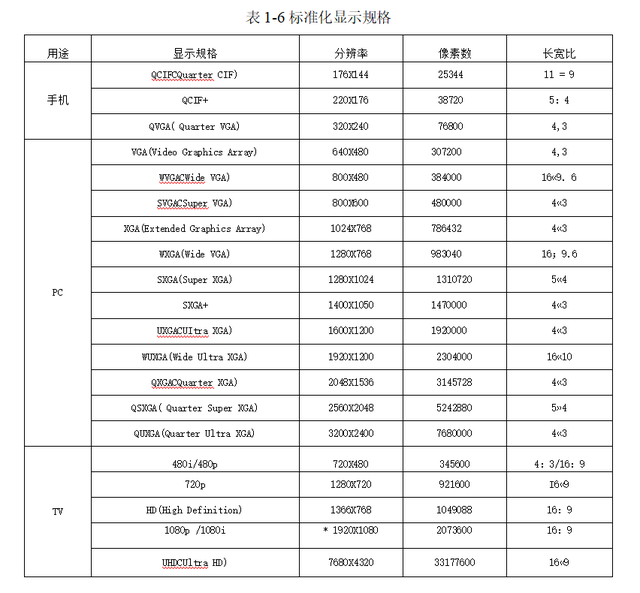 (4) 分辨率(Number of Pixels):TFT-LCD的分辨率表示有效顯示區(qū)域內(nèi)可以用做畫(huà)面顯示的發(fā)光點(diǎn)數(shù)@ ,TFT-LCD中的發(fā)光點(diǎn)稱為像素(Pixel) O分辨率一般以乘法形式表現(xiàn),如1024X768的分辨率,其中1024表示有效顯示區(qū)域水平方向顯示的像素?cái)?shù),768表示垂直方向顯示的像素?cái)?shù)。分辨率體現(xiàn)的是有效顯示區(qū)域的像素總數(shù),分辨率越高,畫(huà)面的解析度(Resolution)也就越高。一般,人眼對(duì)垂直方向的像素?cái)?shù)更敏感。擁有更高的垂直方向分辨率,畫(huà)面 的清晰度就更高。表1-6羅列了一些基本的標(biāo)準(zhǔn)化分辨率規(guī)格。在實(shí)際使用時(shí),顯卡輸出的分辨率(屏幕分辨率)和該TFT-LCD面板的固有分辨率(物理分辨率)相同時(shí),顯示效果最好, 即所謂的"點(diǎn)對(duì)點(diǎn)”顯示。在表1-6中,公用中間分辨率格式(Common Intermediate Format, CIF)的分辨率為352X288。i是隔行掃描的英文interlace的第一個(gè)字母,p是逐行掃描的英文progressive的首字母。