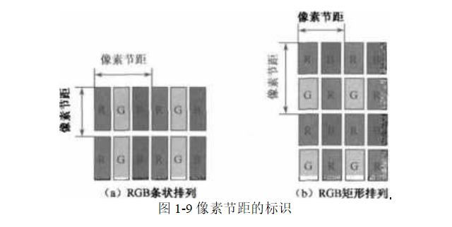 (5) 像素節(jié)距(Pixel Pitch):像素節(jié)距是TFT-LCD有效顯示區(qū)內(nèi)相鄰兩個(gè)像素間的距離,即像素重復(fù)單元的最小長(zhǎng)度。TFT-LCD的像素節(jié)距類似于CRT的點(diǎn)距(Dot Pitch)oTFT-LCD的節(jié)距是固定的,節(jié)距的計(jì)算方式是以面板尺寸除以分辨率所得的數(shù)值,具體計(jì)算會(huì)在顯示屏設(shè)計(jì)章節(jié)中詳細(xì)介紹,對(duì)于彩色TFT-LCD而言,像素包含R、G、B三個(gè)子像素。一般,對(duì)普通的像素條狀排列方式,節(jié)距的標(biāo)識(shí)如圖l-9(a)所示。對(duì)于特殊的像素排列方式,節(jié)距的標(biāo)識(shí)不同,圖l-9(b)給出了RGB矩形排列時(shí)的節(jié)距標(biāo)識(shí)?!包c(diǎn)對(duì)點(diǎn)”顯示時(shí),像素節(jié)距 和字體的大小是對(duì)應(yīng)的,像素節(jié)距小,文字就小。畫(huà)面的細(xì)膩度也是由節(jié)距來(lái)決定的,像素節(jié) 距越小,畫(huà)面越細(xì)膩。更準(zhǔn)確地體現(xiàn)畫(huà)面細(xì)膩度的指標(biāo)是PPKPixel Per Inch)值或DPKDots Per Inch)值,即單位尺寸(25. 4mm)內(nèi)的像素?cái)?shù)目。高精細(xì)的TFT-LCD具有高PPI值(或DPI值),像素節(jié)距越小,PPI值或DPI值越大。