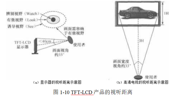 (8) 視聽(tīng)距離:在不同的應(yīng)用領(lǐng)域,TFT-LCD使用者的心態(tài)也是不一樣的。如圖l-10(a)所示,用做電腦顯示器時(shí),使用者身體前傾主動(dòng)地找內(nèi)容,人眼與顯示器的距離在40cm左右比較合適。為了讓顯示器的畫(huà)面完全容納于使用者30°36°的視野范圍以內(nèi),TFT-LCD的尺寸不能過(guò)大,一般在30寸以下為宜。電腦顯示器一般用做細(xì)小的文字編輯處理,TFT-LCD的像素節(jié)距最好在0. 3mm以下。如圖l-10(b)所示,TFT-LCD用作電視,使用者身體后仰被動(dòng)地欣賞內(nèi)容,最佳的視聽(tīng)距離要同時(shí)保證觀賞到的畫(huà)面品質(zhì)和身臨其境的感覺(jué);視聽(tīng)距離太 近,畫(huà)面看起來(lái)粗糙,會(huì)造成眼疲勞。視聽(tīng)距離太遠(yuǎn),會(huì)缺少身臨其境的感覺(jué)。一般,標(biāo)清電視