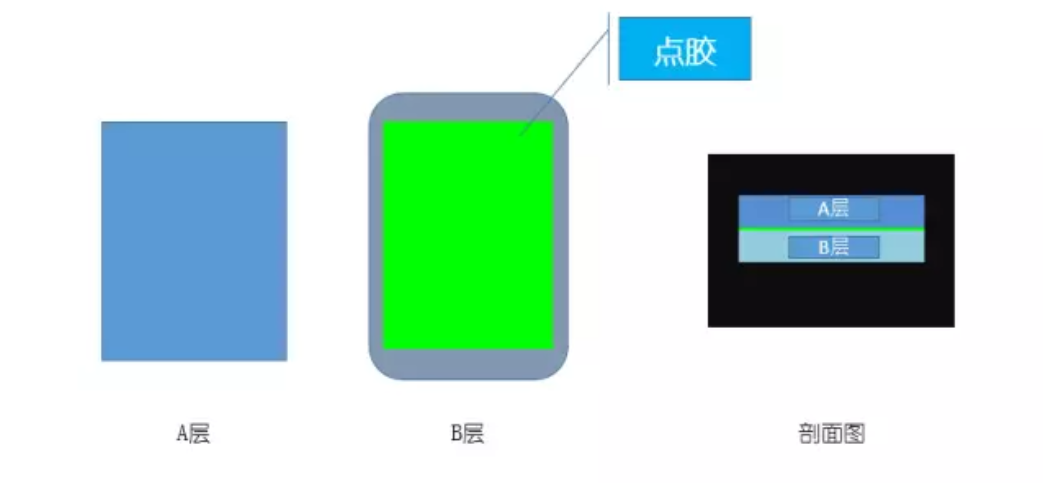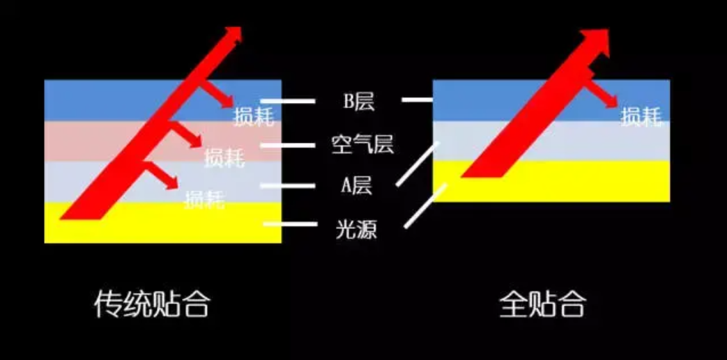 如圖,利用框貼的方式,兩層之間是有空隙的,所以我們的屏幕會(huì)遇到進(jìn)灰現(xiàn)象。為了將解決這種現(xiàn)象,就產(chǎn)生了一種更高級(jí)的貼合方式,叫做全貼合。