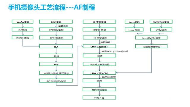 以AF模組為例,CMOS攝像頭模組的生產(chǎn)工藝流程簡(jiǎn)單概括為如下步驟:原物料清洗、Die Bond、Wire Bond、old Mount、Lens/VCM組立、Lens/VCM Mount、后段測(cè)試。