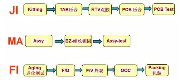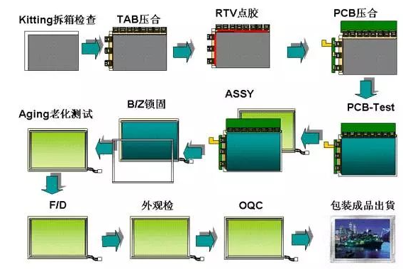 11、COG制程 12、軟性線路板壓合 13、印刷線路板壓合 14、背光模組組裝 15、老化測試